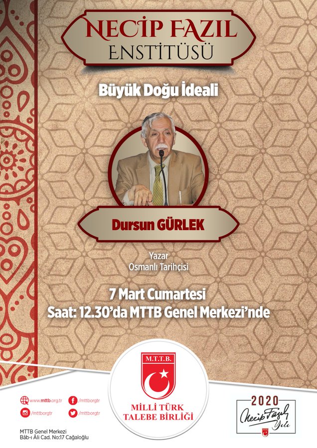 Yazar ve Osmanlı Tarihçisi Sayın Dursun GÜRLEK'in konuşmacı olarak katılacağı 'Büyük Doğu İdeali' konferansına davetlisiniz.