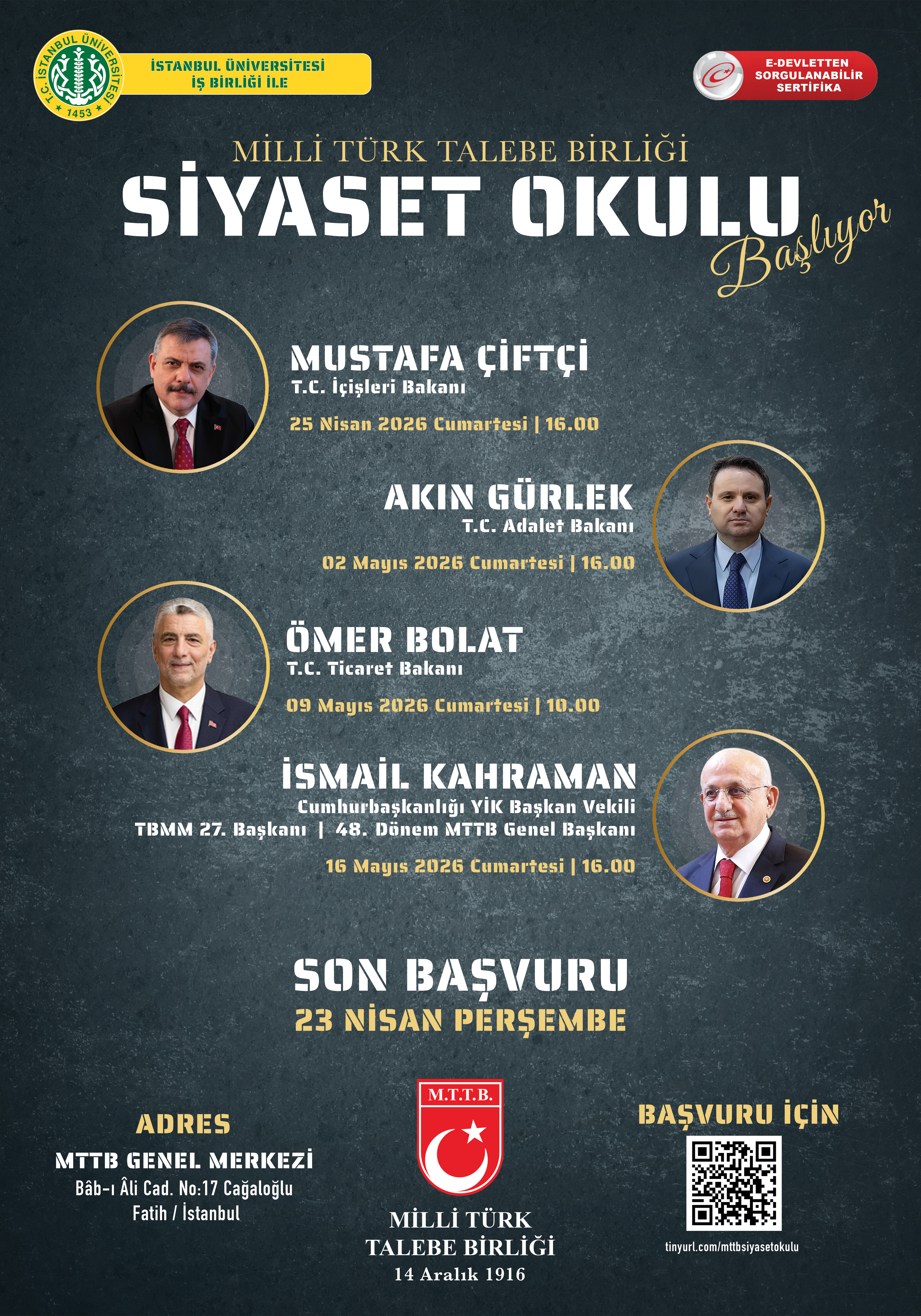 Milli Türk Talebe Birliği Genel Merkezi’nde 4 hafta boyunca sürecek olan Siyaset Okulu; İstanbul Üniversitesi iş birliğiyle, alanında uzman isimleri siz kıymetli katılımcılarımızla bir araya getirerek tecrübe ve bilgi paylaşımına imkân sunacaktır. Bu program sayesinde hem ülkemizdeki hem de dünyadaki siyasi gelişmelere dair bakış açınızı derinleştirme fırsatı bulacaksınız.